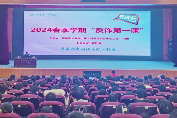 3月7日,保卫处协同桂林市公安局七星公安分局反诈中心在花江校区大礼堂开展2024春季学期“反诈第一课”安全教育活动。活动邀请了桂林市公安局七星公安分局反诈中心主任刘敏作了题为“防范电信网络诈骗”安全教育课。学校800余名学生代表及辅导员代表现场聆听课程,2.1万余人通过线上观看直播的方式参与。
