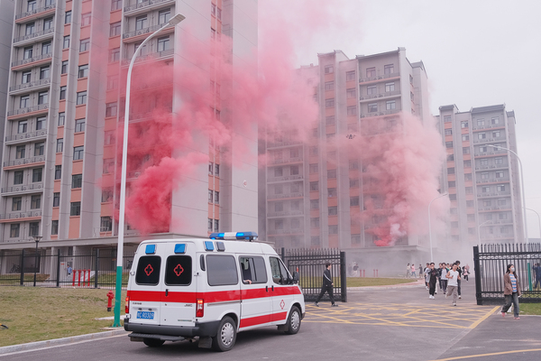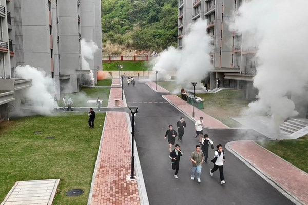 演练设定花江校区学生公寓汀苑发生火灾,楼上有多人被困,亟待救援。灵川县消防救援大队出动2辆消防车,10余名消防指战员火速赶赴现场处置。参加演练的同学们在消防指战员及保卫处人员的指挥下,用湿毛巾紧捂口鼻,按照预定的逃生路线,有序疏散到指定安全地点。整个演练过程紧张有序,灭火行动组、疏散引导组、安全救护组密切配合、反应迅速,达到了预期效果。张达雁对此次疏散演练进行点评。演练结束后,消防宣传人员结合实际案例,讲解了如何防火、如何扑救初期火灾、如何自救逃生等消防安全知识。