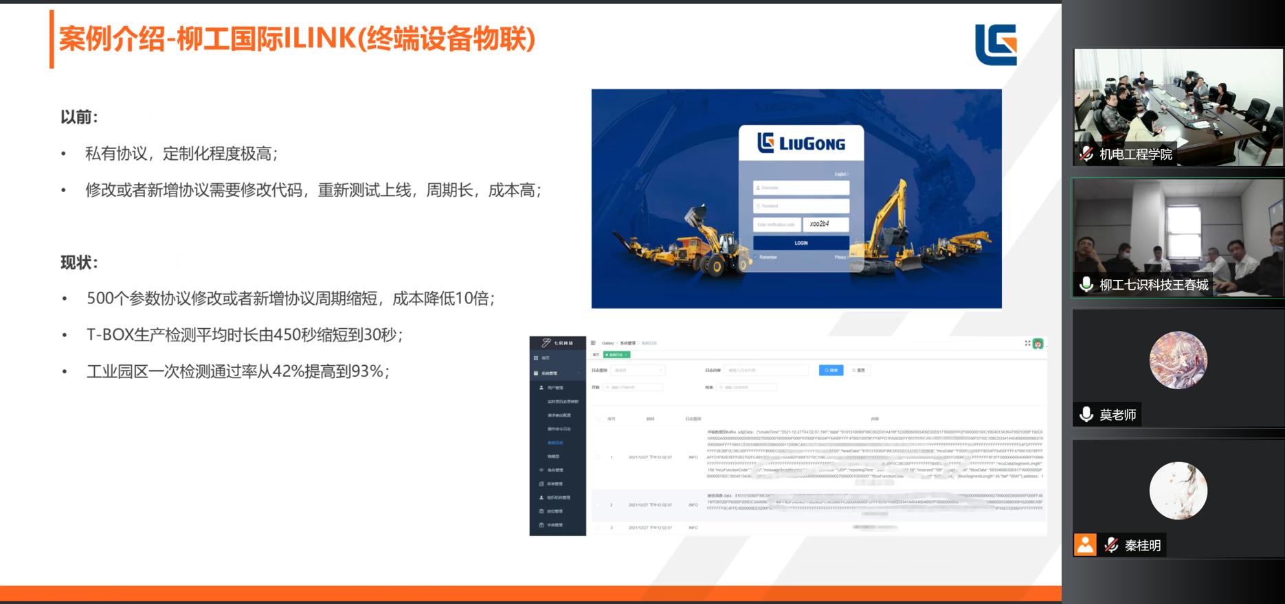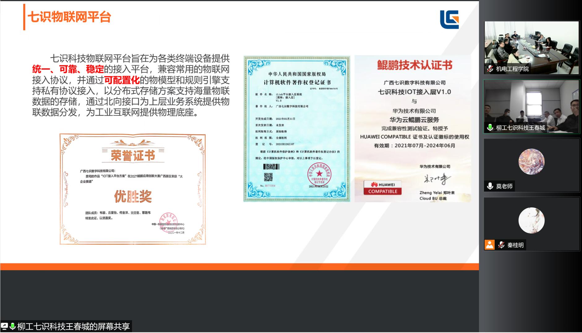 2022年4月7日,机电工程学院与柳工集团广西七识数字科技有限公司线上校企交流会在机电大楼420会议室召开了。院长高兴宇、副院长莫秋云等13人和柳工集团广西七识数字科技有限公司总经理秦桂明等5人出席了本次线上校企交流会。