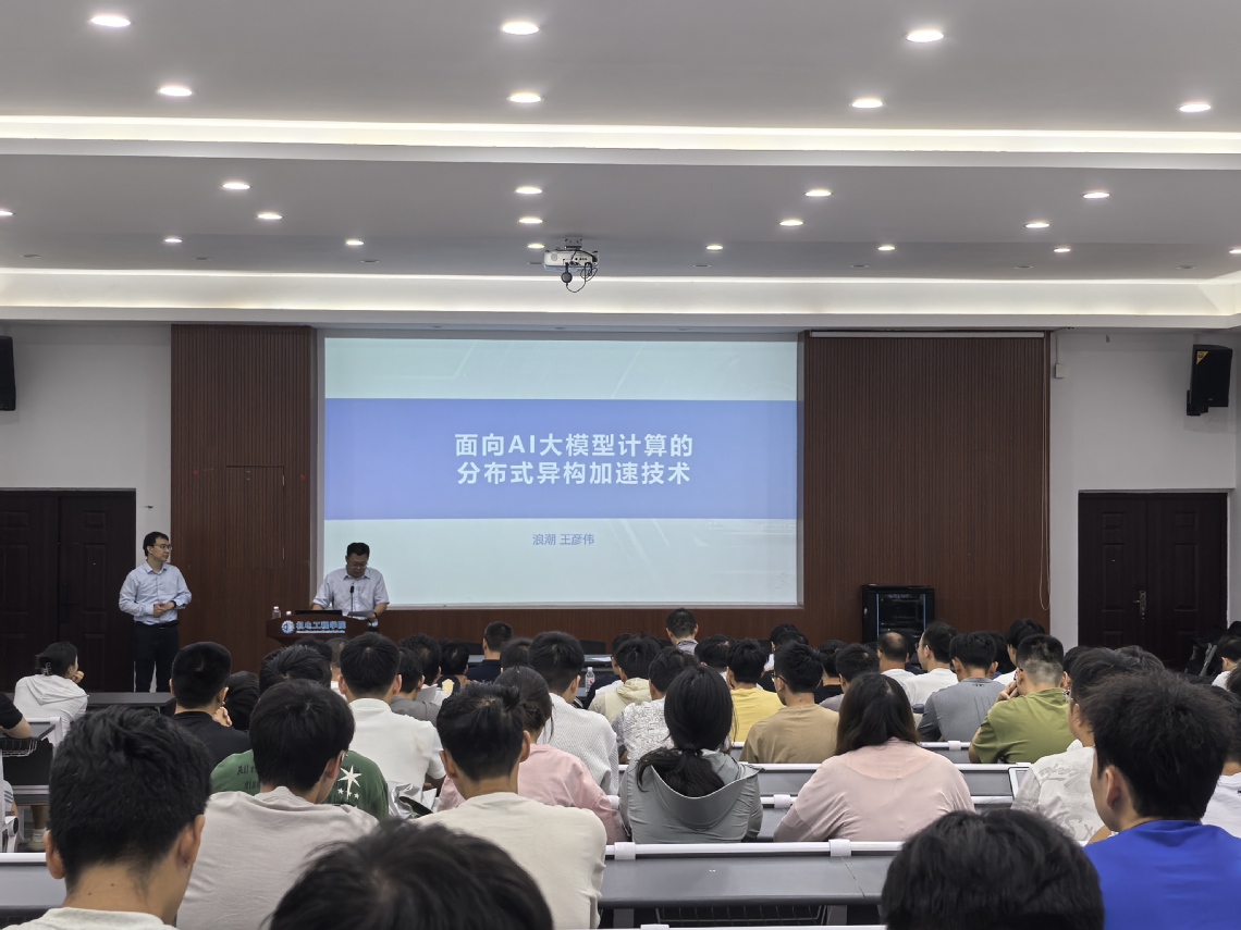讲座上,王彦伟以《面向AI大模型计算的分布式异构加速技术》为主题,介绍了异构计算资源池化技术,以及CPU、GPU、FPGA等多元算力的高效扩展协同;在互连通信方面,介绍了节点内一致性低延时互连和节点间精准丢包重传的RDMA互连技术;同时,融合软硬件协同优化,面向分布式AI计算场景,对网络状态感知、智能通信调度与模型压缩等关键技术进行了探讨。