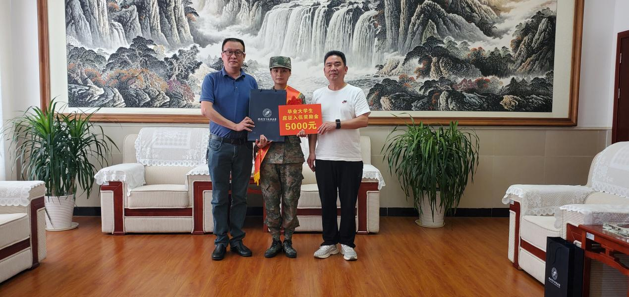 舒福灵代表学院向欧梦同学表示充分肯定和祝贺,并与欧梦同学亲切交谈,他表示,欧梦同学不仅是桂电女生的杰出代表,更是“强军梦”的有力传承者和践行者。希望欧梦到部队后,履行军人职责,担当如山使命,积极投身强军实践,在学习与锻炼中成长为有灵魂、有本事、有血性、有品德的新一代军人。朱小精表示,学校将认真做好拥军优属工作,积极落实优抚政策,同时勉励欧梦同学要遵守纪律、全面学习、锤炼品格,积极发扬桂电精神,展现桂电担当。