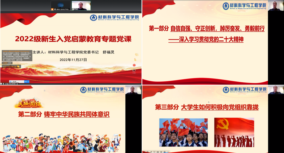 11月27日下午,材料科学与工程学院党委书记舒福灵线上为2022级全体本科新生开展了入党启蒙教育专题党课。课上,舒福灵为同学们详细解读了党的二十大报告内容,同时结合党的二十大精神为同学们讲述了党的性质、宗旨和指导思想等基本知识。其次,就如何铸牢中华民族共同体意识进行了深入阐述。他表示,各位同学要深入学习贯彻党的二十大精神,牢固树立中华民族共同体意识,勇担新时代的历史使命,争做有理想、敢担当、能吃苦、肯奋斗的新时代好青年。党课最后,舒福灵还详细介绍了大学生入党的流程,引导全院新生正确看待入党问题,秉承“正德厚学、笃行致新”的校训,发扬“艰苦创业、自强不息”桂电精神,立德修身,坚定“四个自信”,做到“两个维护”。