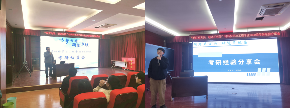 会上,姚青荣老师首先为同学们分析了当今的考研与就业现状,着重介绍了材料科学与工程专业的发展前景,并结合往届实际情况,动员同学们考研;其次何世成结合自己一志愿报考桂电材料学院的经历,以现身说法的形式分享了自己考研的经验和感受,使同学们对考研过程有了更深的了解;最后纪振东老师积极鼓励同学们积极报考桂电材料学院,尽早投入考研,做好考研规划,争取顺利上岸。
