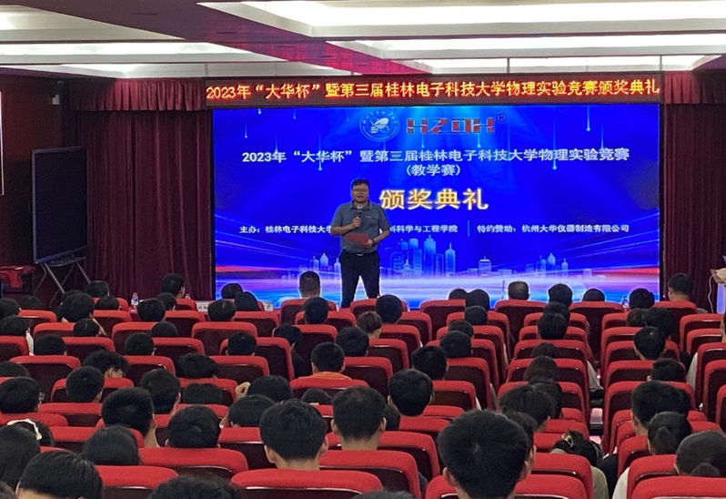 5月31日下午, 2023届“大华杯”第三届物理实验竞赛颁奖典礼在1教106会议室顺利举行,学校教务处副处长赵中华、材料学院院长张坚、党委书记舒福灵和杭州大华仪器制造有限公司总经理郑捷和副总经理靳向荣出席了本次颁奖仪并为获奖学生颁奖。会上,张坚院长和赵中华处长先后作了讲话,对获奖学生表示祝贺,同时对物理实验中心的工作也做出了肯定。与材料学院一直以来保持着紧密合作关系的大华集团负责人郑捷总经理表示以后将会同桂林电子科技大学继续保持紧密、长远的合作。