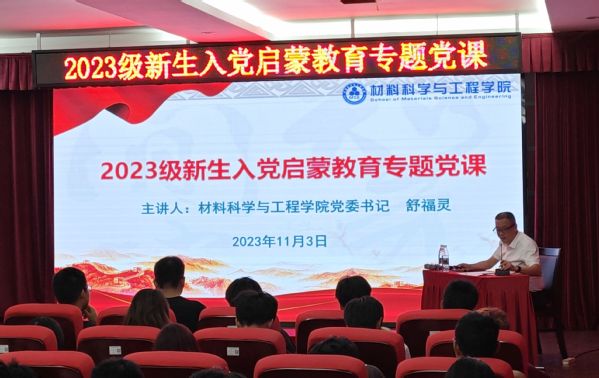11月3日下午,材料科学与工程学院在花江校区1教106会议室开展2023级新生入党启蒙教育专题党课。党课由学院党委书记舒福灵主讲,年级辅导员及2023级新生参加本次党课学习。