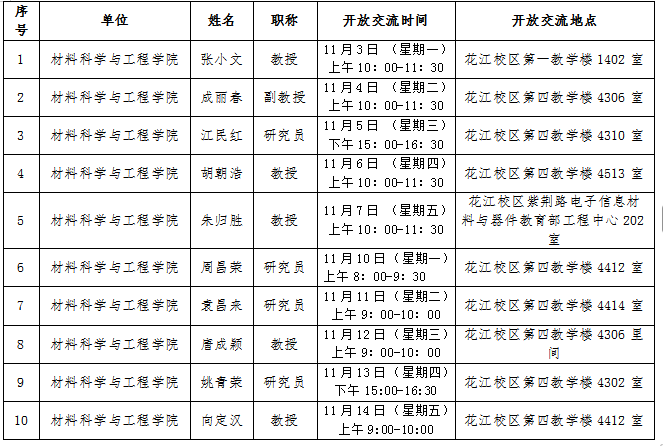 材料科学与工程学院9-10周师生“面对面开放交流”(Open Office Hour)开放交流信息公布