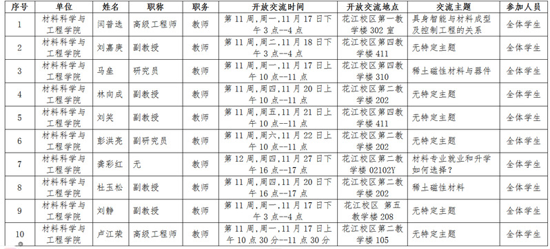 材料科学与工程学院11-12周师生“面对面开放交流”(Open Office Hour)开放交流信息公布