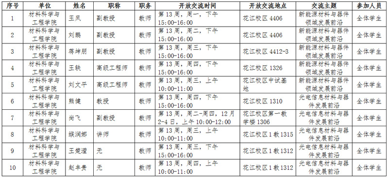 材料科学与工程学院13-14周师生“面对面开放交流”(Open Office Hour)开放交流信息公布