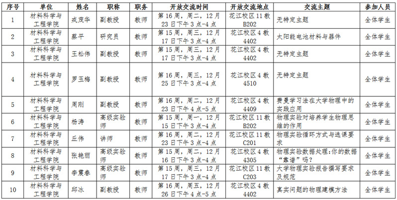 材料科学与工程学院15-16周师生“面对面开放交流”(Open Office Hour)开放交流信息公布