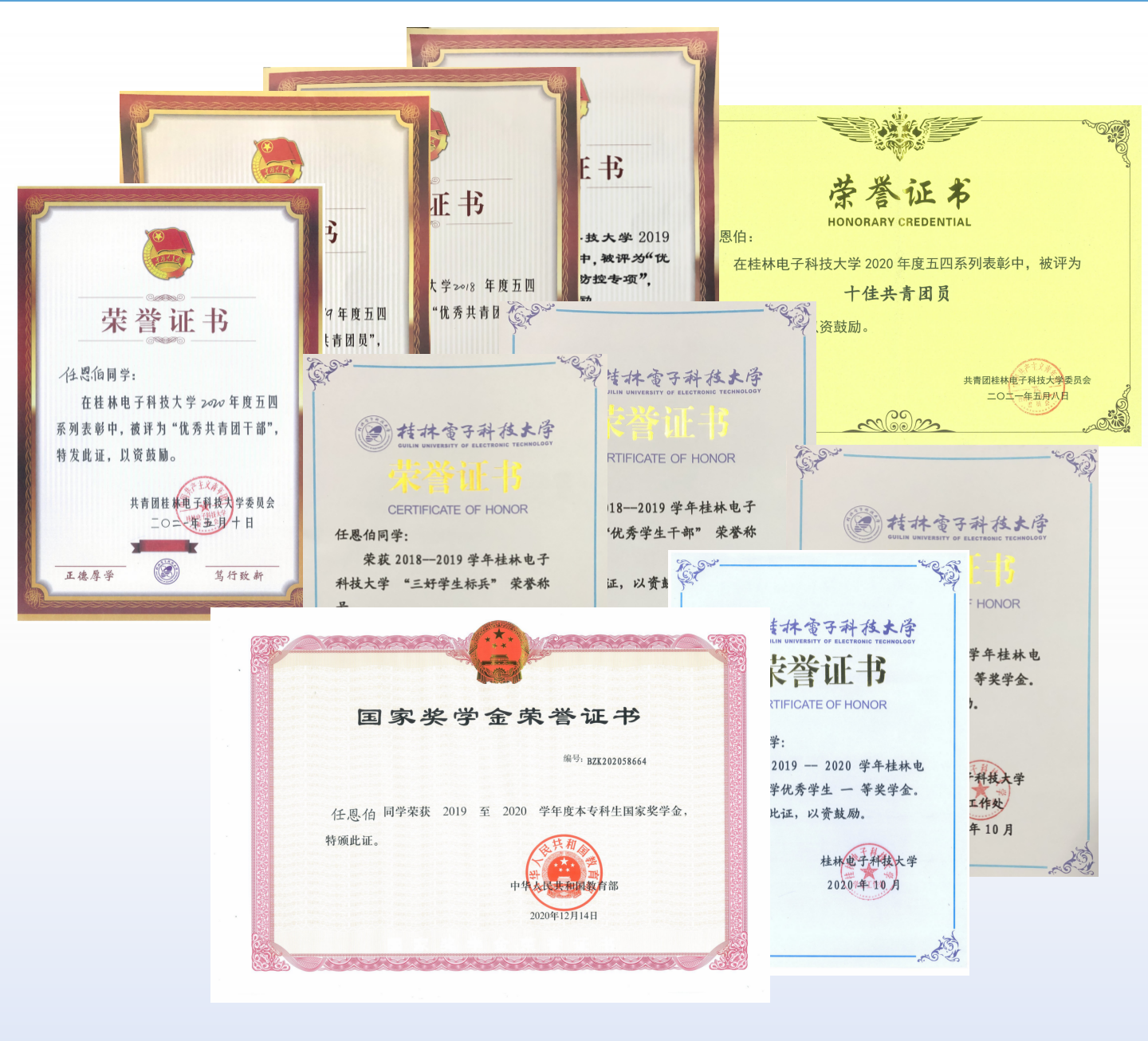 曾获得国家奖学金、中国航天科技CASA奖学金两次、校优秀学生一等奖学金 两次,校优秀共青团干部、十佳团员、优秀共青团员三次、三好学生标兵、三好学生、优秀学生干部三次。