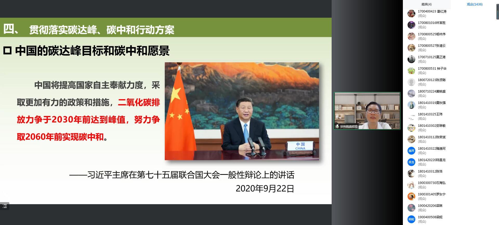 讲座从气候变化的科学认知到政治决策、应对气候变化的工作进展、面临的困难与挑战以及应对气候变化工作建议等四个方面详细普及自治区应对气候变化及“碳达峰”方案。参会师生纷纷表示,讲座内容信息量大,涉及知识面广,通过本次讲座使大家深刻认识到环境保护的重要性,更加坚定了一起为实现“碳达峰,碳中和”做出努力的信念。