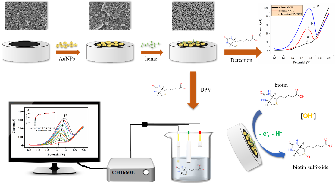 作者使用血红素(Heme)与金纳米颗粒(AuNPs)在玻璃碳电极(GCE)上原位偶联制备一种简单的传感器Heme/AuNPs/GCE,用于超灵敏地测定生物素,可以实现从0.0050~50.0000 μmol·L-1的宽检测范围和0.0016 μmol·L-1的低检测极限。文中利用电化学分析和前沿轨道计算阐明了机理,表明生物素电化学氧化涉及一个电子和一个质子的转移,生成生物素亚砜。研发的传感器表现出优异的选择性、再现性和稳定性,具有高鲁棒性。回收率在97.20-105.70%之间,相对标准误差小于8.71%,具有良好的实用性。研究表明,这种方法可以用于定量检测许多食品中的生物素,包括牛奶、婴儿配方奶粉、面粉、橙汁、芒果汁、蛋清和蛋黄。所有的测量都不需要对食物进行任何复杂的准备或前处理过程,也不需要抗体、亲和素增加特异性,展现出即时测试(POCT)的巨大潜力。该研究得到国家自然科学基金(No. 61661014,81873913,61861010,61627807)和广西地区自然科学基金(No. 2018GXNSFAA281198,2018GXNSFBA281135)等资助。