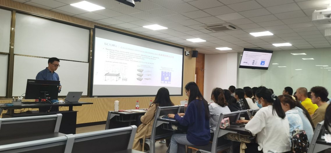 蒋教授主要围绕其团队当前研究的两大课题展开。首先,他深入剖析了实现可持续给排水管网系统的关键,详细阐述了污水混凝土管道中微生物的腐蚀机理,以及在实际工程应用中如何运用这一理论解决实际问题。其次,蒋教授向我们展示了他们在污水流行病学研究及最新进展方面的突破,他们基于污水流行病学原理,研发出一套通过调查污水中PPCPs 等污染物,从而推断人体健康状况的方案,为部分同学的研究提供了新的思路。