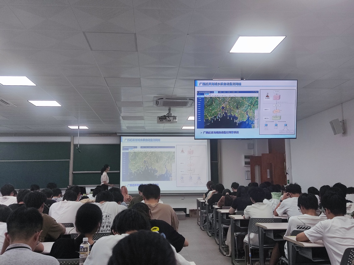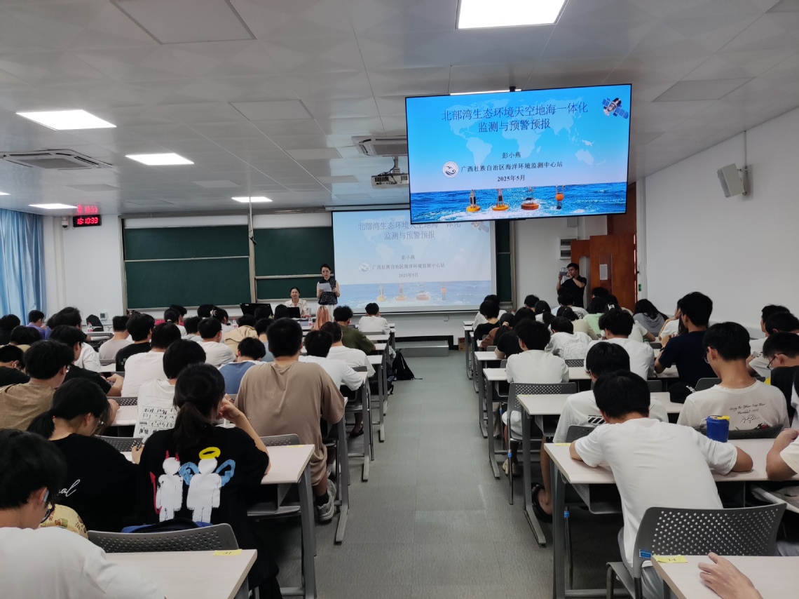 讲座伊始,彭小燕主任指出北部湾的战略地位与生态挑战。作为我国沿海经济发展的重要区域和生态安全屏障,北部湾承载着经济开发与生态保护的双重使命。但陆海生态系统的复杂交互,叠加工业排污、航运活动等人类干扰,使得传统监测手段难以满足实时、精准预警的需求。在此背景下,构建“天空地海一体化”监测网络成为守护北部湾碧海蓝天的关键突破口。此外,彭小燕主任详细阐述了监测网络的创新架构。该网络打破数据壁垒,将卫星遥感的广域宏观监测、航空监测的高分辨率成像、地面站点的精准数据采集及海洋浮标的实时动态追踪有机融合。谈及预警预报技术,彭小燕主任重点介绍了智能化预警模型的研发与应用。依托覆盖广西近岸重点海域的自动监测站点,搭建了高效的数据传输与分析系统,并引入人工智能算法,构建起“数据采集 - 智能分析 - 精准预警”的全链条体系。该模型能够快速处理海量监测数据,精准识别水质异常波动,对赤潮爆发、富营养化等潜在风险提前发出警报,为海洋污染防治、生态修复决策提供了强有力的科技支撑。
