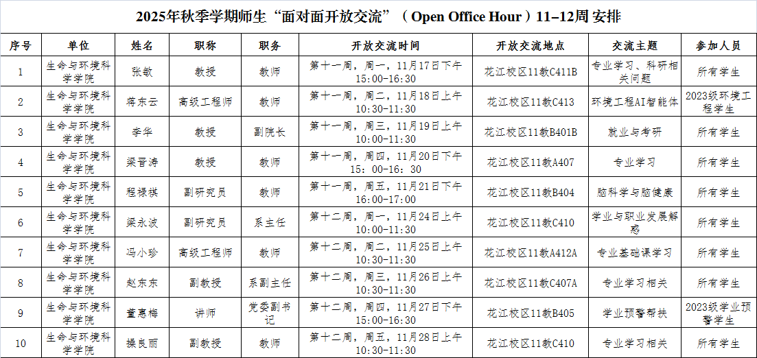 关于2025年秋季学期师生“面对面开放交流”(Open Office Hour)11-12周 安排表公示