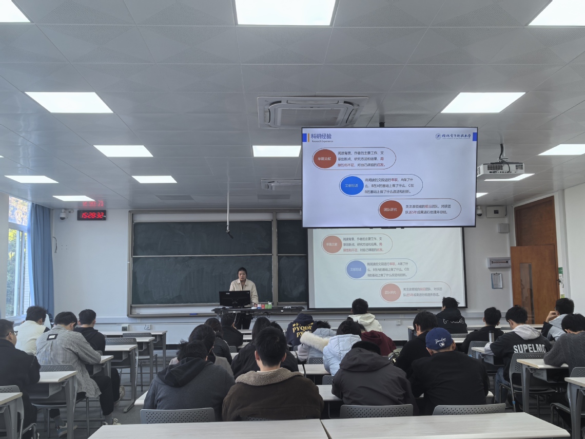 活动中,蒋雪萍同学以“研究生科研与工具使用心法”为主题,分享了如何高效规划科研进程、平衡学业与竞赛的经验,重点介绍了从文献管理、数据分析到学术写作等多类实用科研工具的使用技巧。沈小晓同学围绕“碳中和技术与我们的AI机遇”这一前沿议题展开分享,鼓励大家将个人研究方向与国家重大需求相结合。