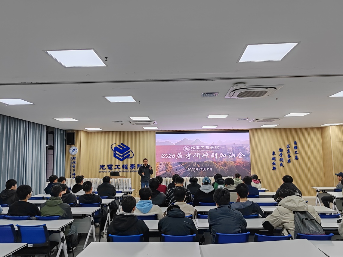 12月7日,光电工程学院2026届考研冲刺加油会在花江慧谷2311会议室举行。学院党委副书记梁爽、毕业班辅导员及全体2026届考研学生参加。