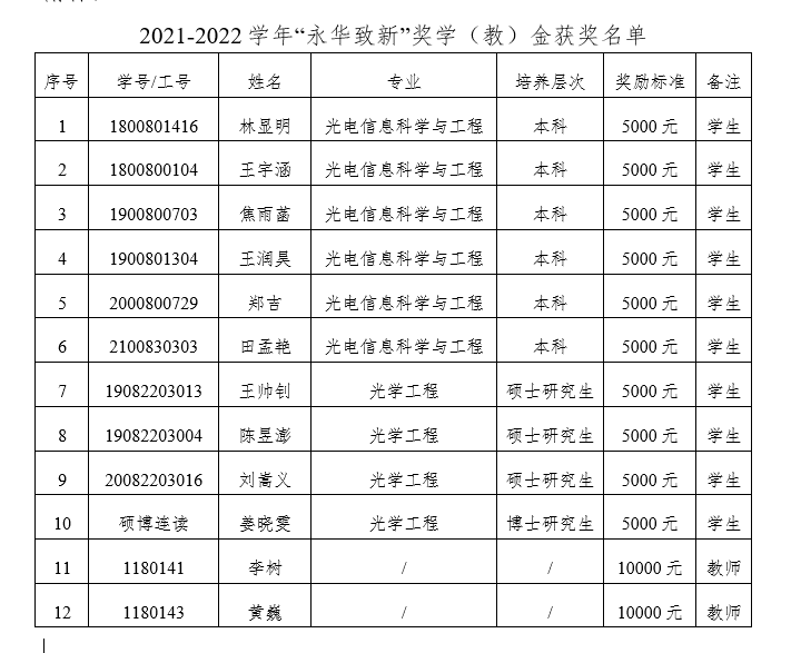 光电工程学院2021-2022学年 “永华致新”奖学(教)金获奖名单公示