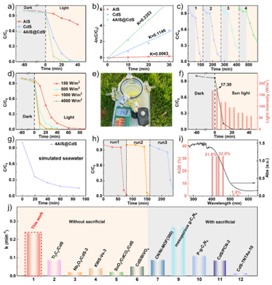 1、“点笼”核壳结构4AIS@CdS在可见光下,无需外加空穴牺牲剂,20分钟内实现了99.3%的显著铀去除效率,最高量子效率达32.0%,其反应速率分别比纯CdS和纯AIS高出2.1倍和37.3倍,速率与光催化效率超过此前文献报道(图4)。