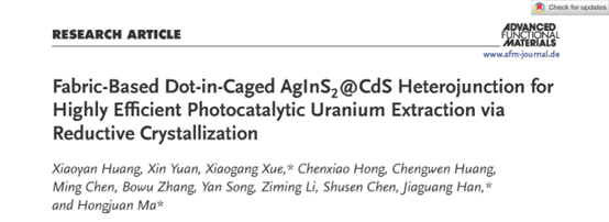 近日,我院联合上海大学在AgInS2@CdS异质结光催化还原晶化促进海水提铀机制与应用研究方面取得新的进展。研究成果以“Fabric-Based Dot-in-Caged AgInS2@CdS Heterojunction for Highly Efficient Photocatalytic Uranium Extraction via Reductive Crystallization”为题发表于材料类Top期刊《Advanced Functional Materials》(影响因子19,中科院分区1区),文章DOI: 10.1002/adfm.202513087。光电工程学院博士研究生黄小艳为第一作者,光电工程学院薛小刚副研究员、韩家广教授以及上海大学马红娟教授为共同通讯作者,我校为论文的第一完成单位。