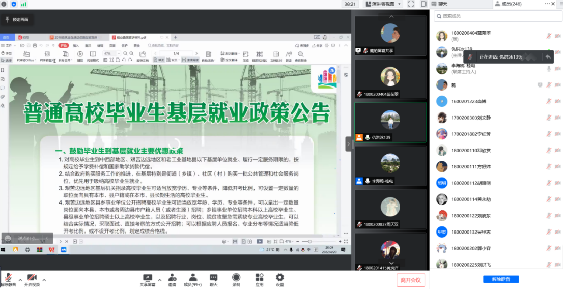 4月20日晚,信息与通信学院在春季招聘周启动之际,通过腾讯会议召开2018级就业促进动员暨政策宣传线上会议,学院党委书记仇洪冰、院长李海鸥及2018级200多名未就业学生参加了会议。