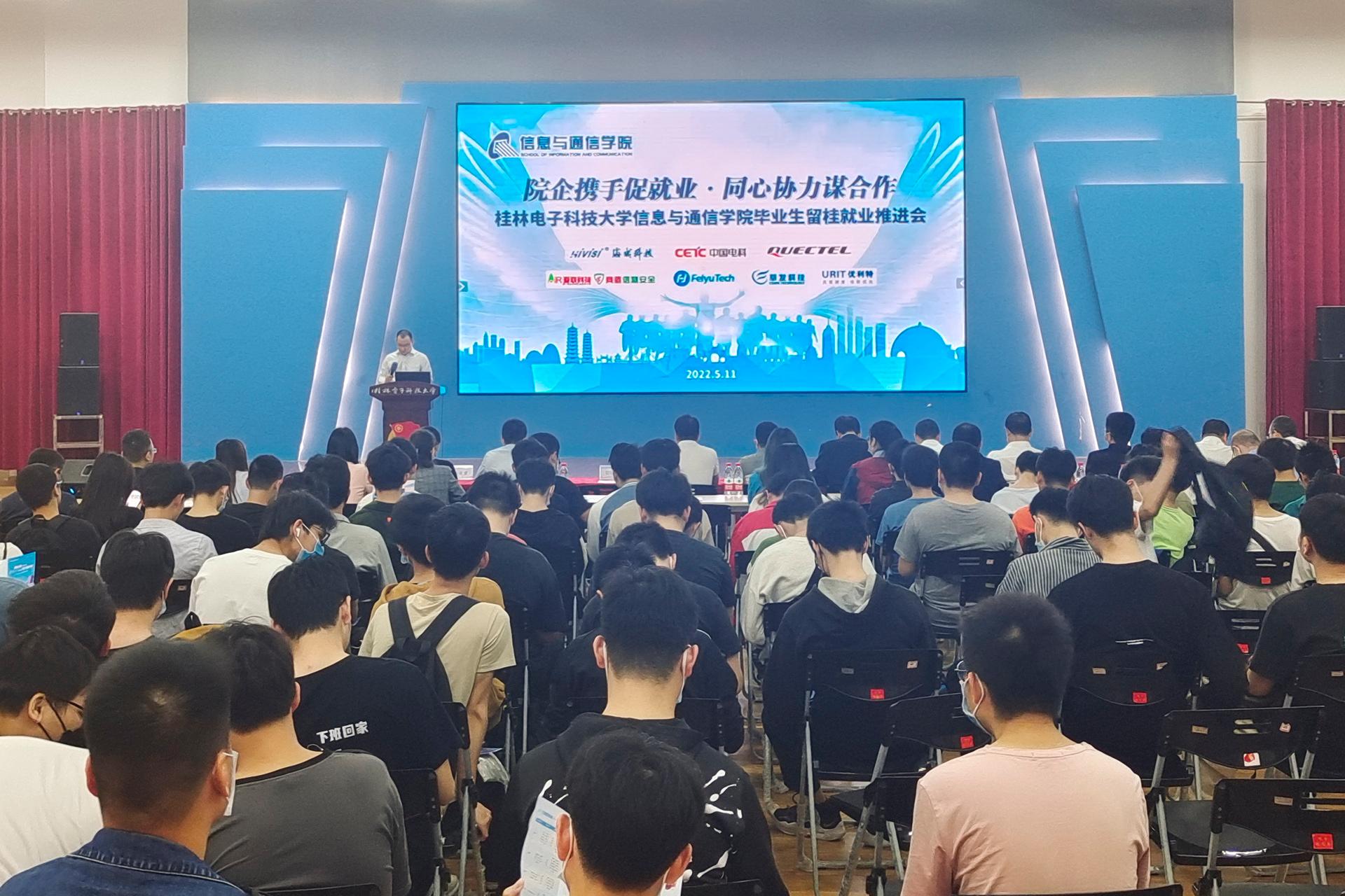 5月11日,信息与通信学院在大学生活动中心演艺厅召开留桂就业推进会,会议邀请了桂林市人才服务中心组织中国电子科技集团公司第三十四研究所、桂林飞宇科技股份有限公司等7家桂林企业来校招聘。7家企业相关负责人,信息与通信学院党委书记仇洪冰、院长李海鸥及其他院领导,学院300多名毕业生和大三实习生一同参加了会议。