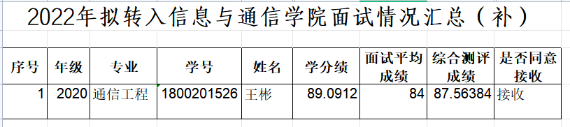 根据《信通教【2022】2号-2022信息与通信学院转专业工作实施方案》,经学院专家组面试,综合学生专业排名、学分绩、面试成绩,王彬(退伍复员)等1名同学符合2022信息与通信学院转专业条件。现对2022年信息与通信学院接收转专业学生结果予以公示。公示期为三个工作日。