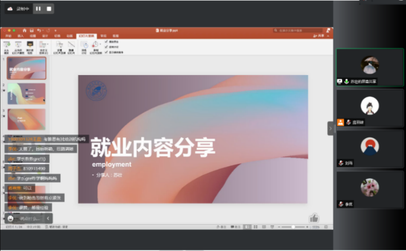 苏壮同学介绍了就业前应做哪些方面的准备,包括简历的制作注意事项以及推荐许多投递简历的app;再者是从自己亲身经历讲述面试的流程与内容;最后是分享自己工作中的内容,并鼓励学弟学妹早日明确自己的学习目标与方向。