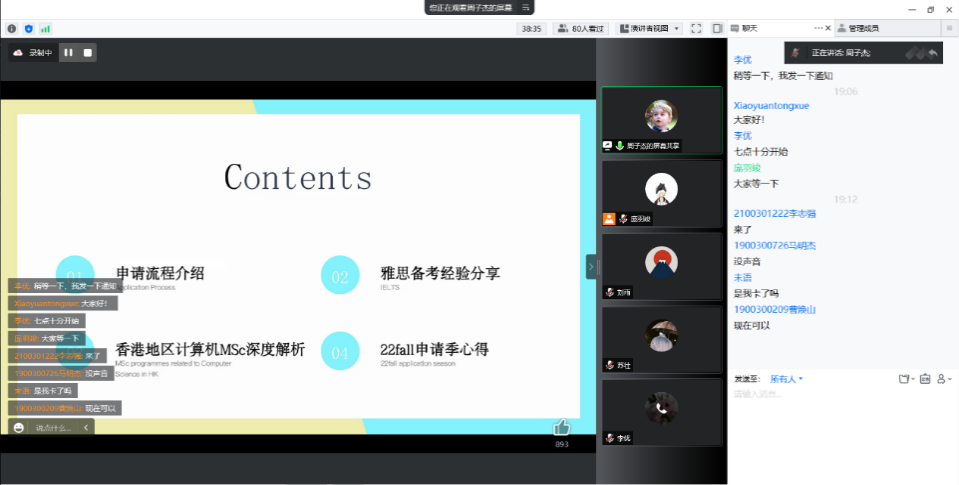 留学海外的周子杰同学和刘雨同学,从留学申请、雅思备考经验、香港地区计算机相关专业的深度解析、GPA成绩、科研以及实习等各方面进行了经验分享,同时对学弟学妹们普遍关心的海外留学政策、签证办理等也进行了讲解,鼓励学弟学妹们多扩展自己的视野,让自己的人生有更多可能性。