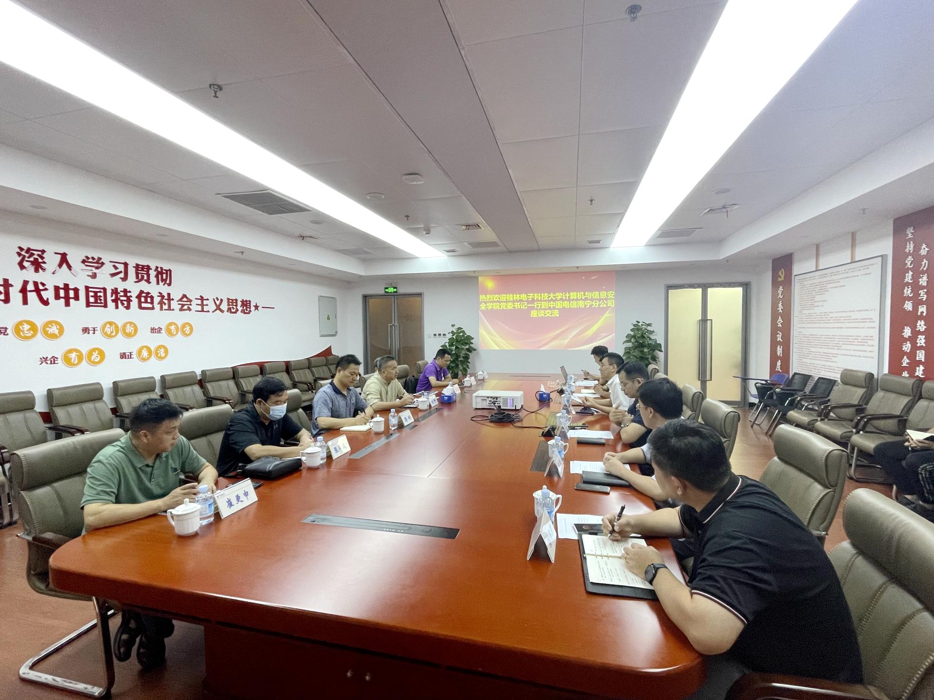 在与中国电信南宁公司的座谈会上,中国电信南宁公司总经理王会贤向与会人员就南宁电信的发展情况、中国电信天翼云资源布局与能力、“天翼云”、电信云机房等方面进行了详细介绍。计算机与信息安全学院党委书记文辉及学院教师就学校发展沿革、办学成就、师资力量、科研建设、专业建设、人才培养、南宁研究院建设等方面进行了介绍。与会双方希望进一步加强交流,促进校企合作,充分发挥双方优势,实现资源互补,深化产教融合,强化办学特色,不断提升人才培养质量,更好地服务地方经济快速发展。