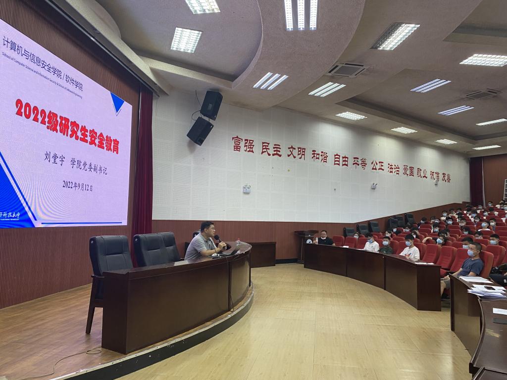 9月12日下午15时,计算机与信息安全学院在三教一楼报告厅举办面向2022级研究生新生的大学校园安全教育讲座,本次讲座由学院党委副书记刘堂宇老师主讲,研究生辅导员主持,全体2022级研究生参加。