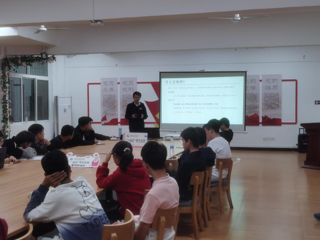 为激励广大同学学习积极性和内生动力,发挥朋辈引领的榜样作用,营造良好的学习氛围,计算机与信息安全学院以“一站式”学生社区为平台,积极打造”周末学习加油站“。2022年11月以来,学院本科生计算机科学第一党支部每周末进入“一站式”社区开展了保研分享交流会。学院本届保研的14名优秀毕业生,在交流会上从为什么读研、保研政策解读、大学四年规划、如何提升自身能力等方面分享了自己宝贵的经验,并认真耐心为低年级同学们答疑解惑,加深大家对考研的了解,让大家更加明确了学习目标。