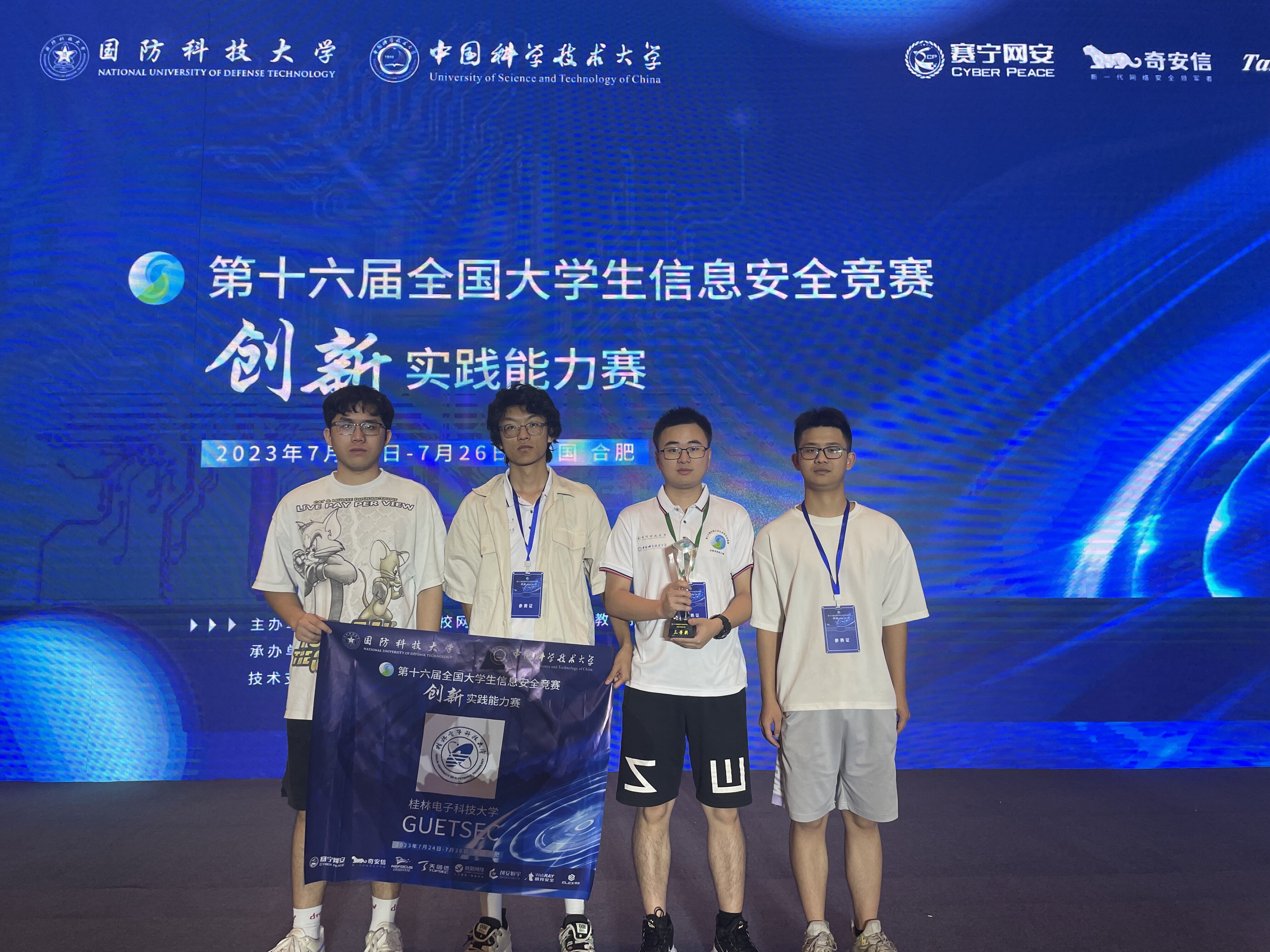 本次大赛分为线上初赛、线下分区赛和全国总决赛3个阶段,综合考察参赛学生漏洞挖掘、漏洞利用、漏洞修补、流量分析、团队协作等综合实践能力。共吸引全国500余所高校、2494支战队、8242人报名参赛,经过激烈角逐,全国总决赛共有80支战队入围。由我校计算机与信息安全学院信息安全专业卢崇竣、潘宇恒、郜路阳、张楗君同学组成的GUETSEC战队获得总决赛三等奖。