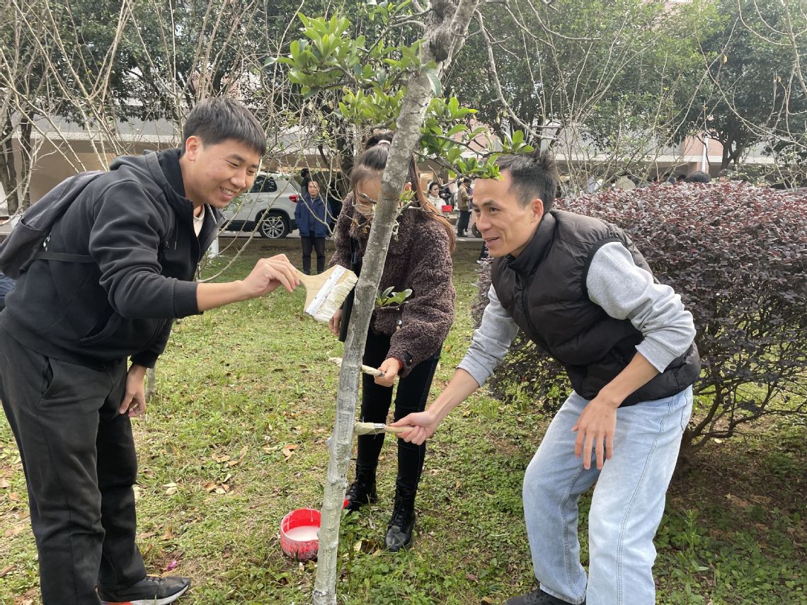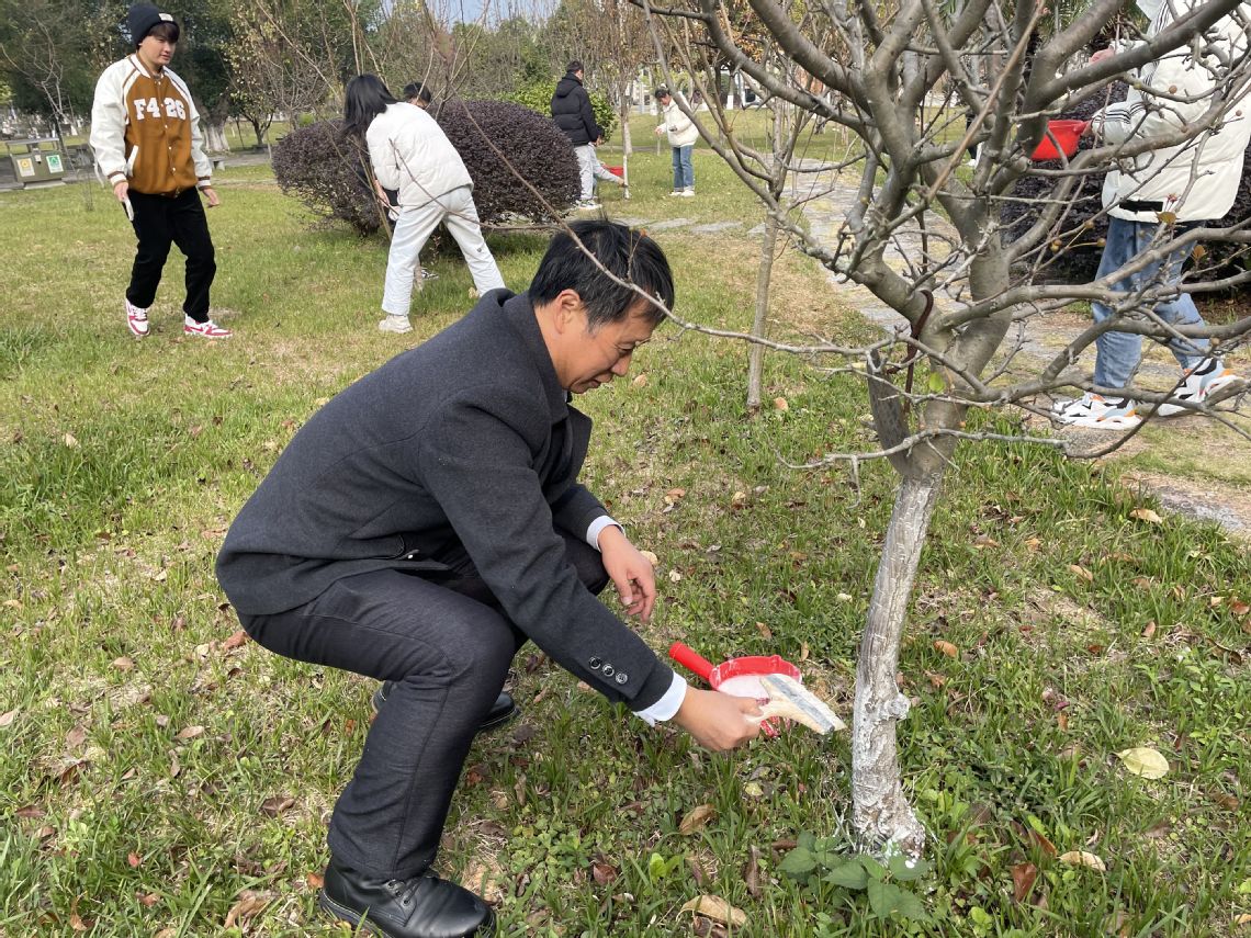2023年12月1日下午,我院组织师生党员在花江校区第16教学楼附近的小游园开展冬季防虫防蛀树木涂白劳动实践活动。
