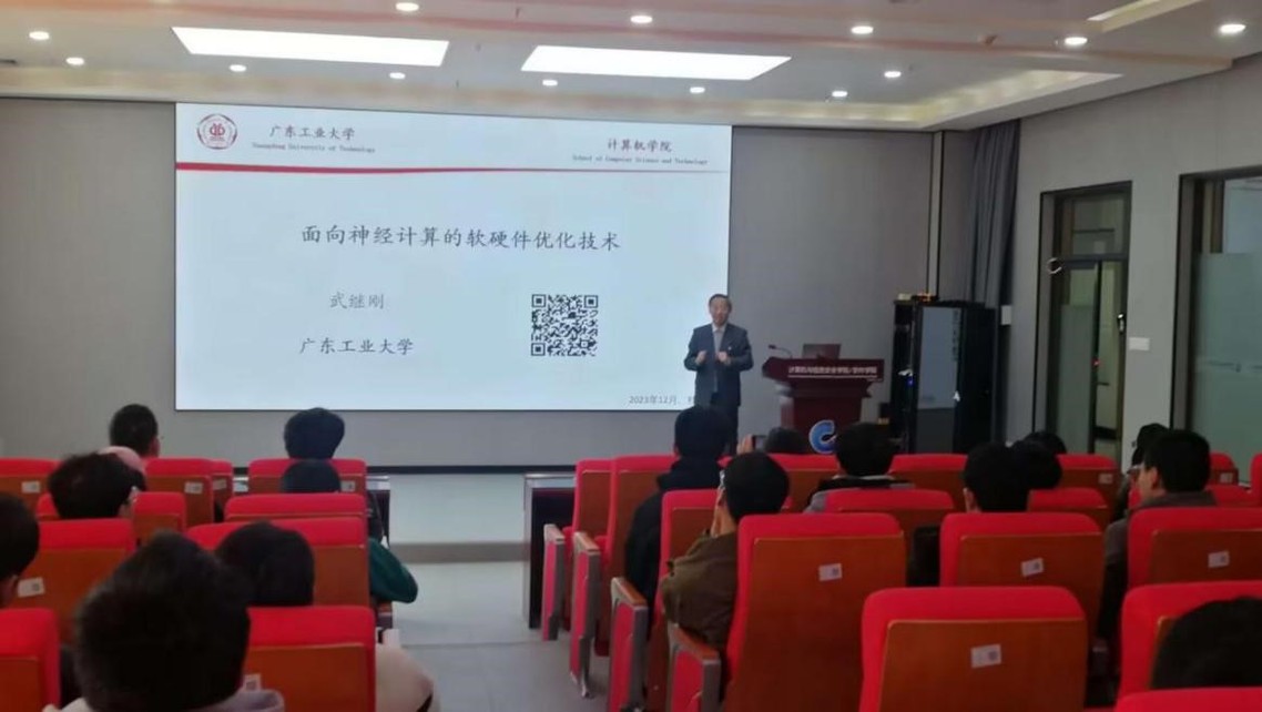 2023年12月26日,应学院、广西可信软件重点实验室邀请,广东工业大学百人计划特聘教授、教育部集成电路软硬件一体化工程研究中心副主任、中国人工智能学会离散智能计算专委会常务委员武继刚教授带领其研究生团队到我校开展学术交流报告会。交流报告会由广西可信软件重点实验室主任蔡国永教授主持。学院教师和广西可信软件重点实验室的部分师生代表参加本次学术交流报告会。