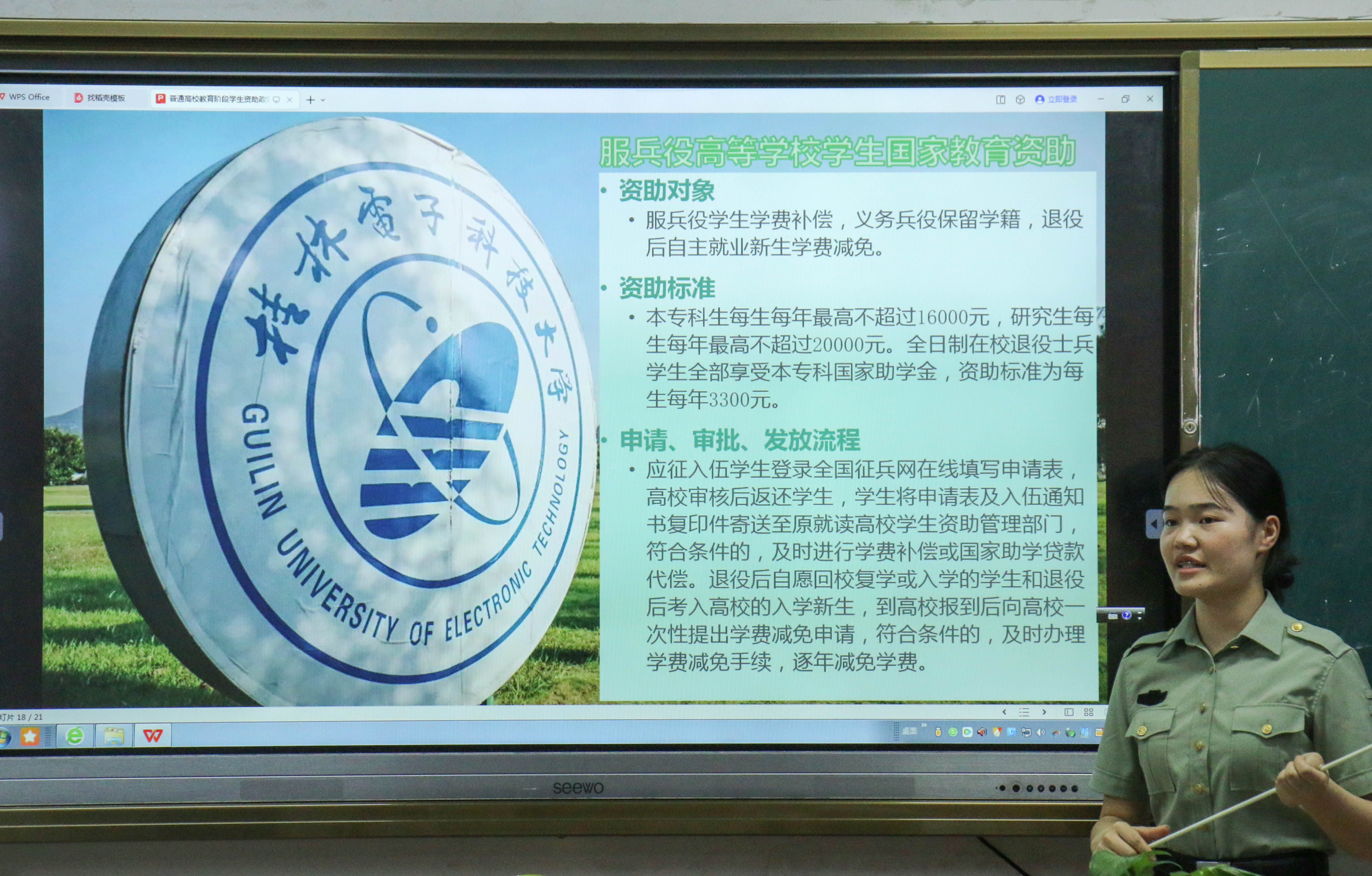 宣讲过程中,黄玉燕详细介绍了各项资助政策的内容。其中包括家庭经济困难大学生入学资助、国家助学贷款、服兵役高等学校学生国家教育资助、自治区人民政府奖学金、桂林电子科技大学学生奖助学金政策。黄玉燕还跟同学们分享了自己精彩的军旅生涯,鼓励同学们珍惜时光、努力学习,乘着资助政策的东风,实现梦想、报效祖国。