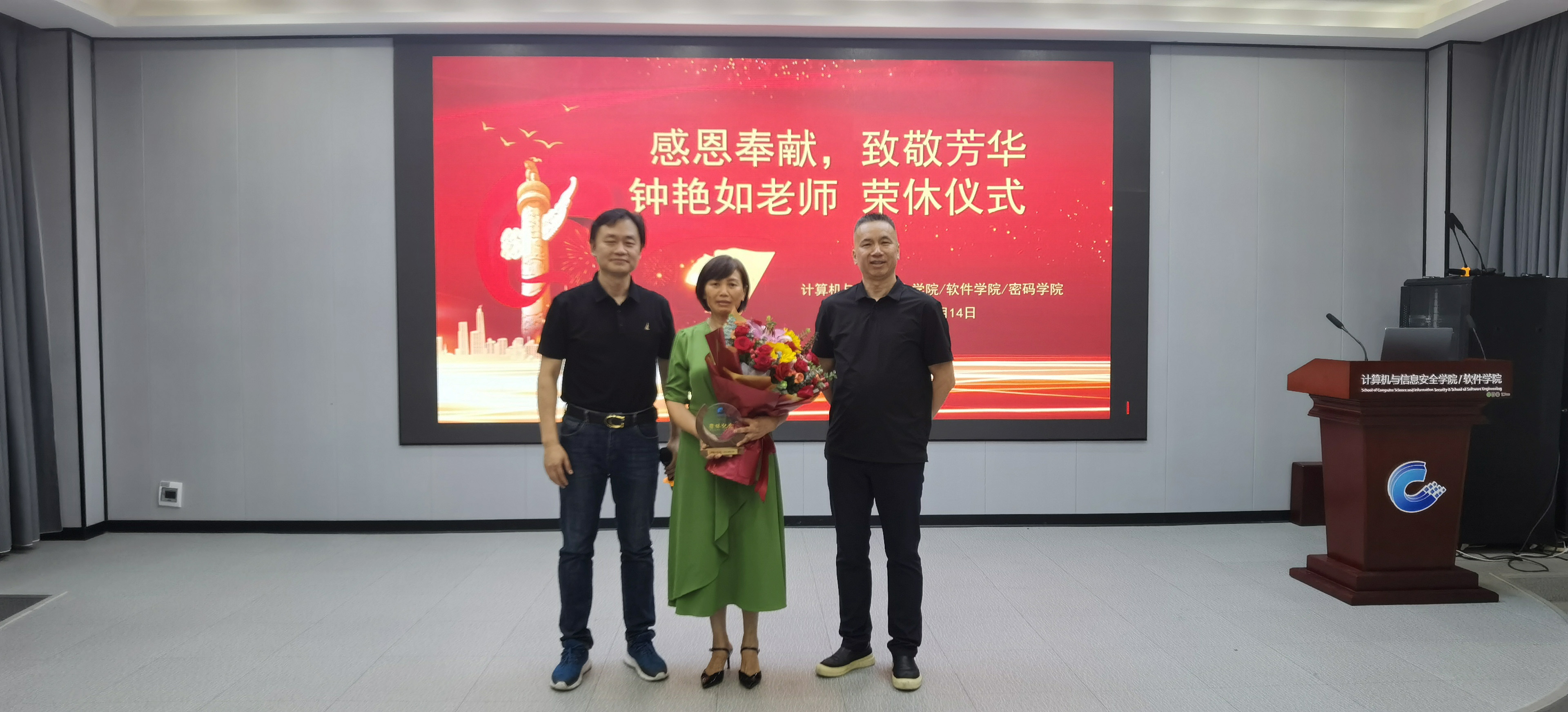 仪式回顾了钟老师在学院教学的点滴过往,在教学、科研和学生培养等方面取得了杰出成就。在现场的掌声中,学院党委书记文辉为钟老师献上鲜花,学院院长刘建明为钟老师颁发荣休证书。