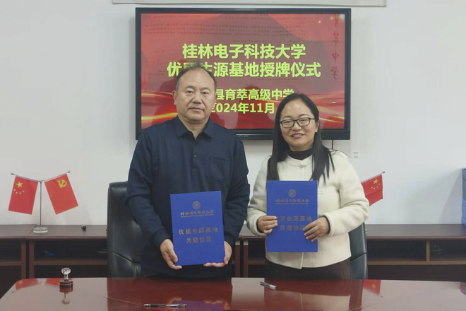 11月8日,我院硕士生导师李优赴安徽涡阳开展招生宣传工作。李优向涡阳县育萃高级中学相关领导介绍了我校的专业设置、学科发展、人才培养以及毕业生就业等情况。双方就2025年高考招生政策、社会实践等事宜进行了交流。我校为涡阳县育萃高级中学授予“桂林电子科技大学优质生源基地”牌匾。