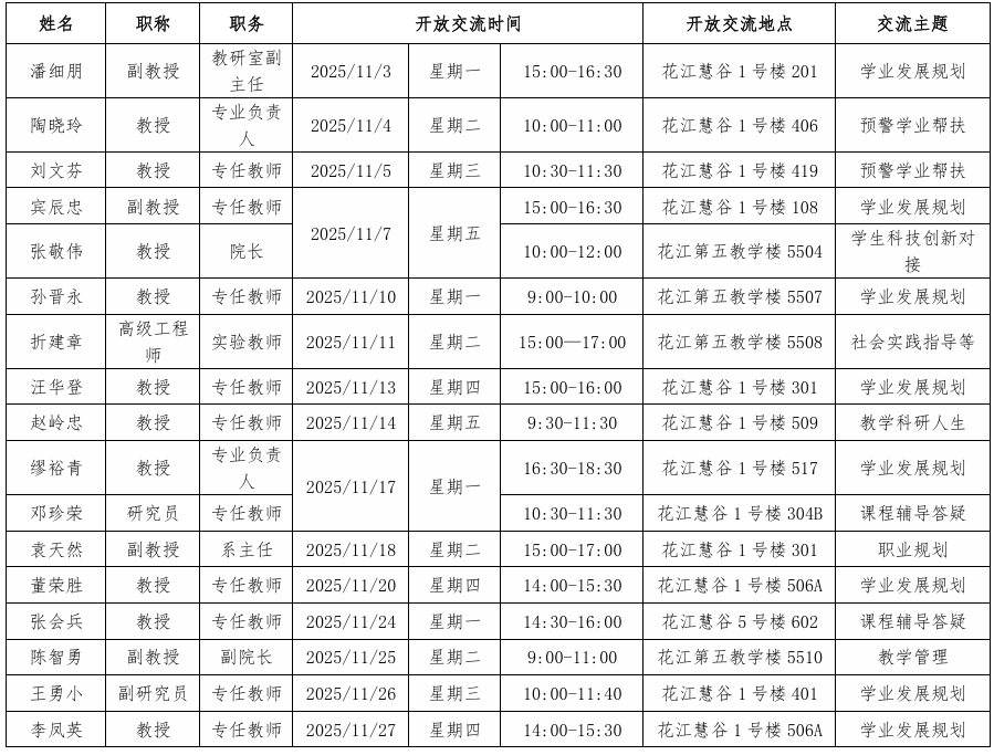 我院在2025年11月的教师开放交流时间如下,欢迎同学们根据安排表,与老师们就感兴趣的话题进行探讨与交流。
