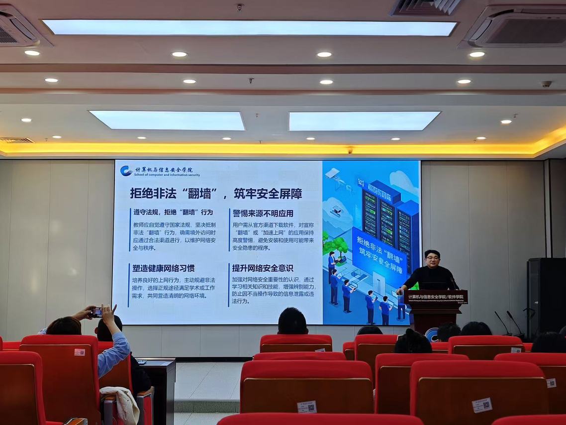 讲座紧扣“网安则国安,国安则民安”的核心要义展开。刘堂宇结合相关法律法规,系统解读了“翻墙”行为的违法性质及其对国家网络安全的潜在威胁。他强调,全体师生必须牢固树立网络安全意识,严守规则底线,自觉规范上网行为,坚决杜绝“翻墙”等违规操作,共同维护清朗、稳定、安全的校园网络空间。