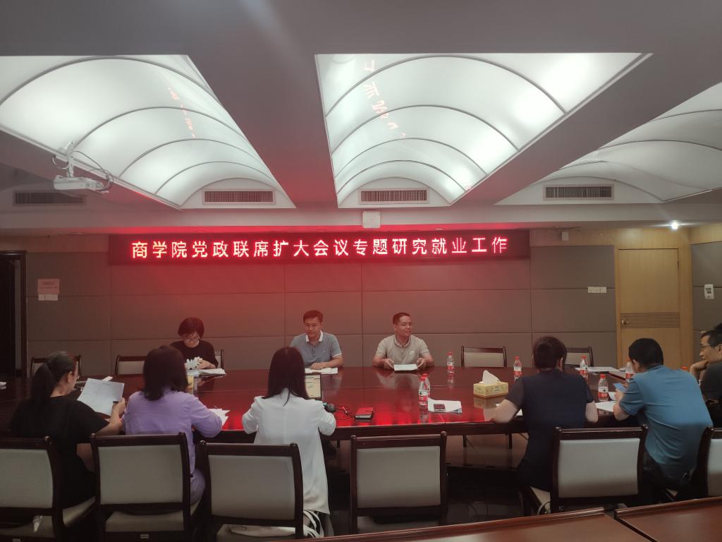 2022年07月23日7月22日上午,商学院在金鸡岭校区10教403办公室召开党政联席扩大会议专题研究就业工作,学院党委书记张金顺、院长张发明、党委副书记师晓婧、副院长花均南、院长助理、系主任、毕业班辅导员和MBA教育中心就业工作人员参加会议。