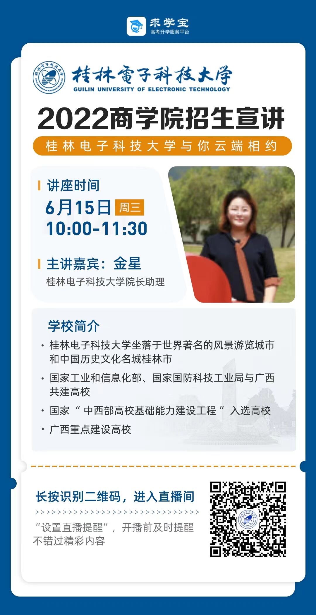 2022年6月15日10:00,我院国际事务部主任金星将代表学院参加2022高校招生宣讲会商学院专场直播,欢迎广大家长及考生观看。