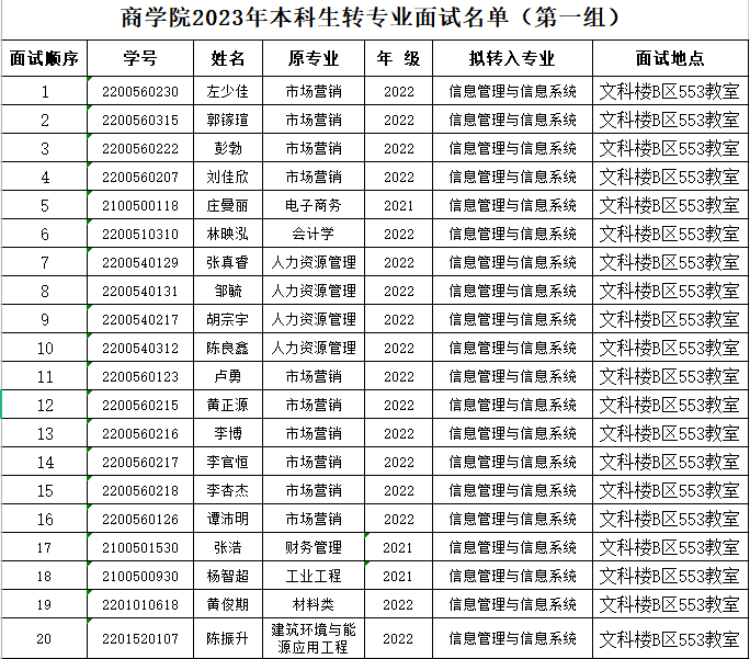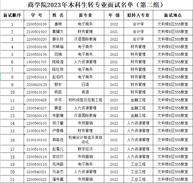 2023年05月08日根据《关于印发<桂林电子科技大学本科生专业分流及转专业管理办法(修订)>的通知》(桂电教〔2021〕6号)和《商学院本科生转专业管理办法(修订)》(桂电商[2023]7号)要求,我院将于2023年5月11日下午开展本科生转专业面试工作,具体通知如下: