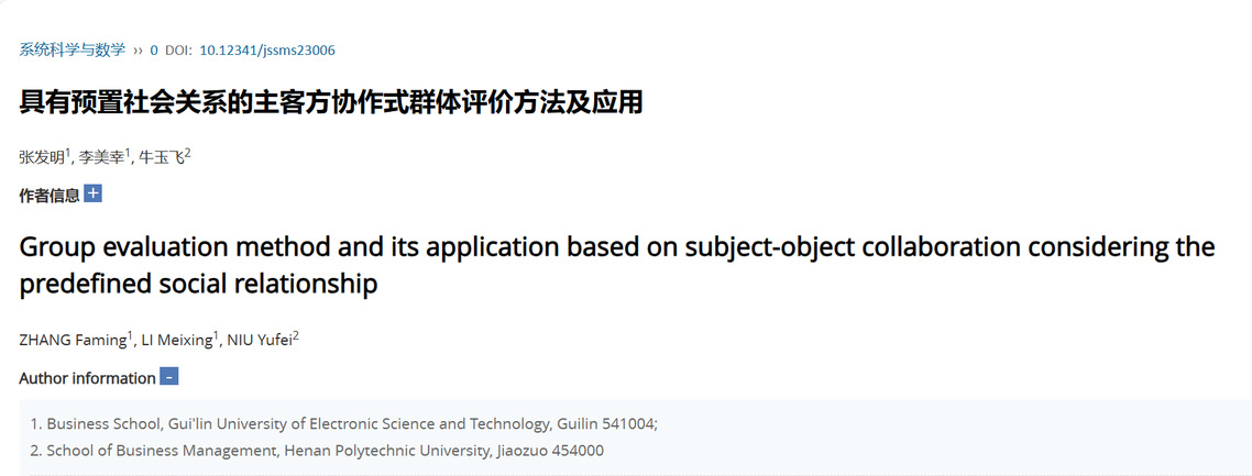 2023年10月29日近日,商学院管理科学与工程专业2021级研究生李美幸在FMS管理科学高质量期刊的中文T2类期刊《系统科学与数学》发表题为“具有预置社会关系的主客方协作式群体评价方法及应用”的高水平论文,导师张发明是第一作者,我校为该论文第一完成单位。研究受到国家自然科学基金资助项目(72161006)、教育部人文社科资金项目(21XJA630009)、广西哲学社会科学规划项目(21FGL037)、广西自然科学基金项目(2021JJA180078)、江西省主要学科学术和技术带头人项目(20194BCJ22001)、广西新文科研究与实践项目(XWK2022011)的支持。
