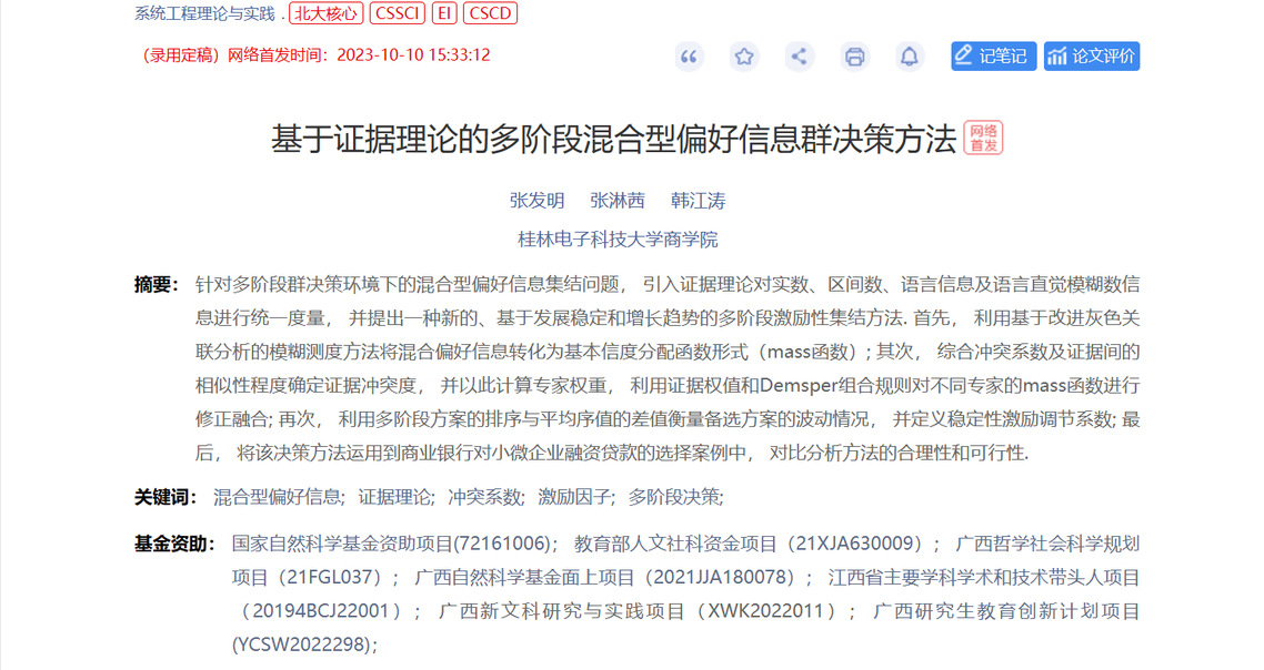 2023年10月29日近日,商学院管理科学与工程专业2021级研究生张淋茜在国家自然科学基金委管理科学部认定A类期刊、FMS目录T1期刊的《系统工程理论与实践》发表题为“基于证据理论的多阶段混合型偏好信息群决策方法”的高水平论文,导师张发明是第一作者,我校为该论文第一完成单位。研究受到国家自然科学基金资助项目(72161006)、 教育部人文社科资金项目(21XJA630009)、广西哲学社会科学规划项目(21FGL037)、 广西自然科学基金面上项目(2021JJA180078)、江西省主要学科学术和技术带头人项目(20194BCJ22001)、 广西新文科研究与实践项目(XWK2022011)、广西研究生教育创新计划项目(YCSW2022298)的支持。