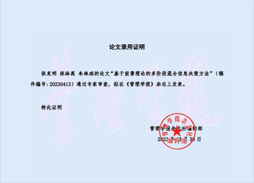 2023年11月14日近日,商学院管理科学与工程专业2021级研究生张淋茜在国家自然科学基金委管理科学部认定B类期刊、FMS目录T2期刊的《管理学报》录用题为“基于前景理论的多阶段混合信息决策方法”的高水平论文,导师张发明是第一作者,我校为该论文第一完成单位。研究受到国家自然科学基金资助项目(72161006);教育部人文社科资金项目(21XJA630009);广西哲学社会科学规划项目(21FGL037);广西自然科学基金面上项目(2021JJA180078);江西省主要学科学术和技术带头人项目(20194BCJ22001);广西新文科研究与实践项目(XWK2022011)的支持。