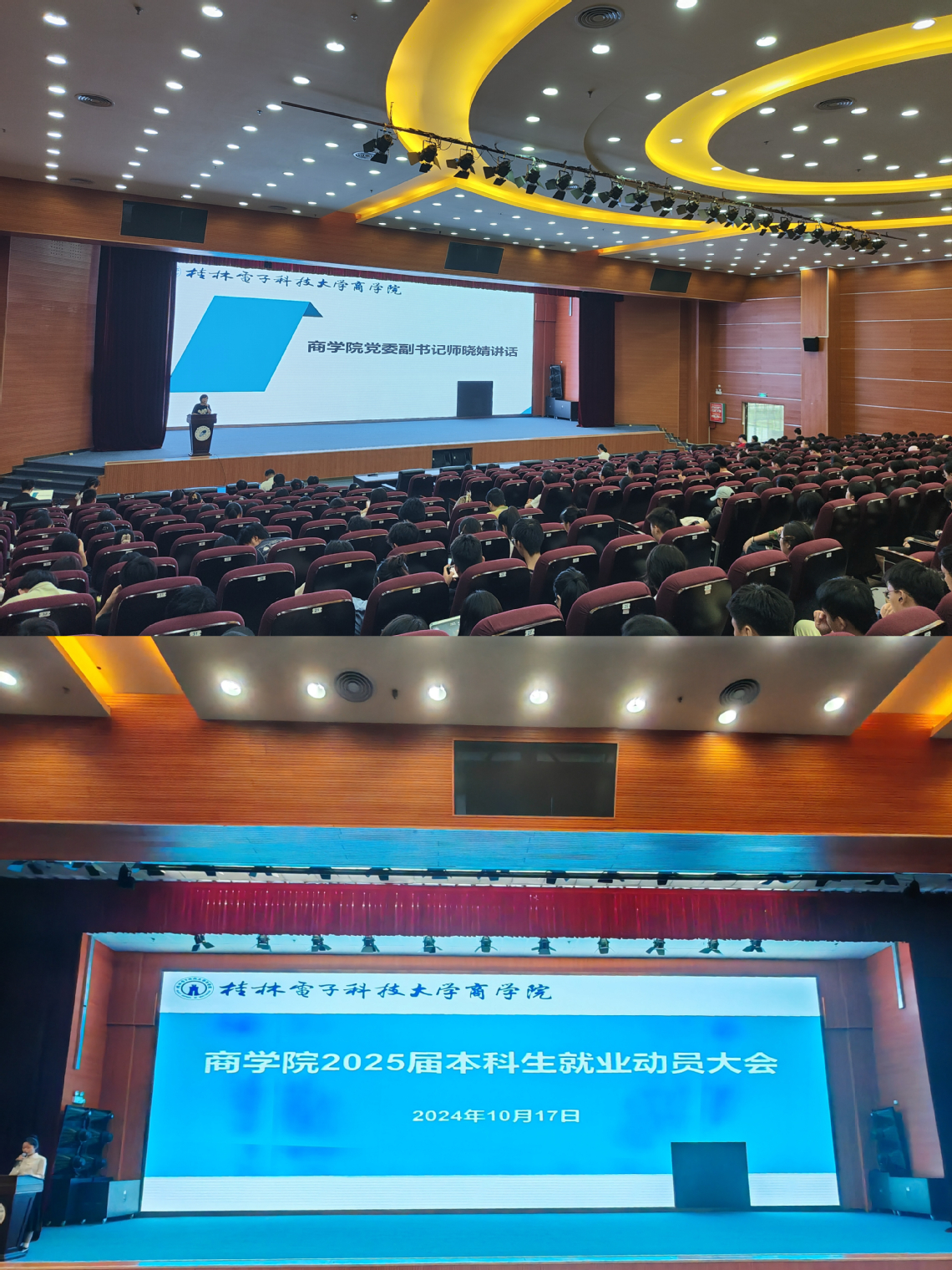 近期,商学院在花江校区会议中心大礼堂成功举办2025届本科生就业动员大会。商学院党委副书记师晓婧、毕业班辅导员以及全体毕业生参与会议。 会上,师晓婧从就业的重要性、就业政策做了重点介绍,结合学院近几年就业情况、来校招聘企业情况,分析了2025届毕业生就业形势和机遇挑战。鼓励广大毕业生坚定就业信心,树立科学的、正确的择业观和就业观,明确企业岗位需求,正确认识自身能力,合理规划,做好就业准备。随后,毕业班辅导员就求职就业安全、学校就业平台使用和相关注意事项等内容进行了说明。