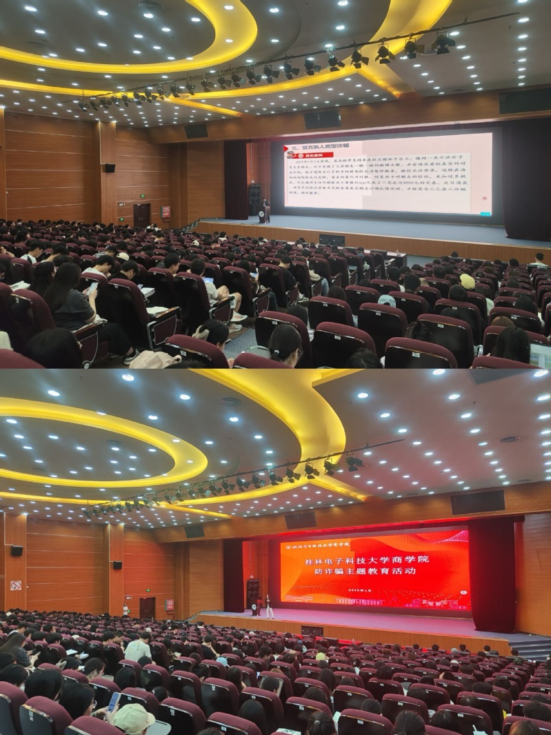 2025年04月15日4月14日下午,商学院联合保卫处在花江校区大礼堂举办防诈知识讲座,邀请桂林市公安局反诈中心一大队梁建展担任主讲人。学院党委副书记王辉、团委书记吕小玉、全体辅导员及800余名学生代表共同参与,深入学习防范电信网络诈骗知识。
