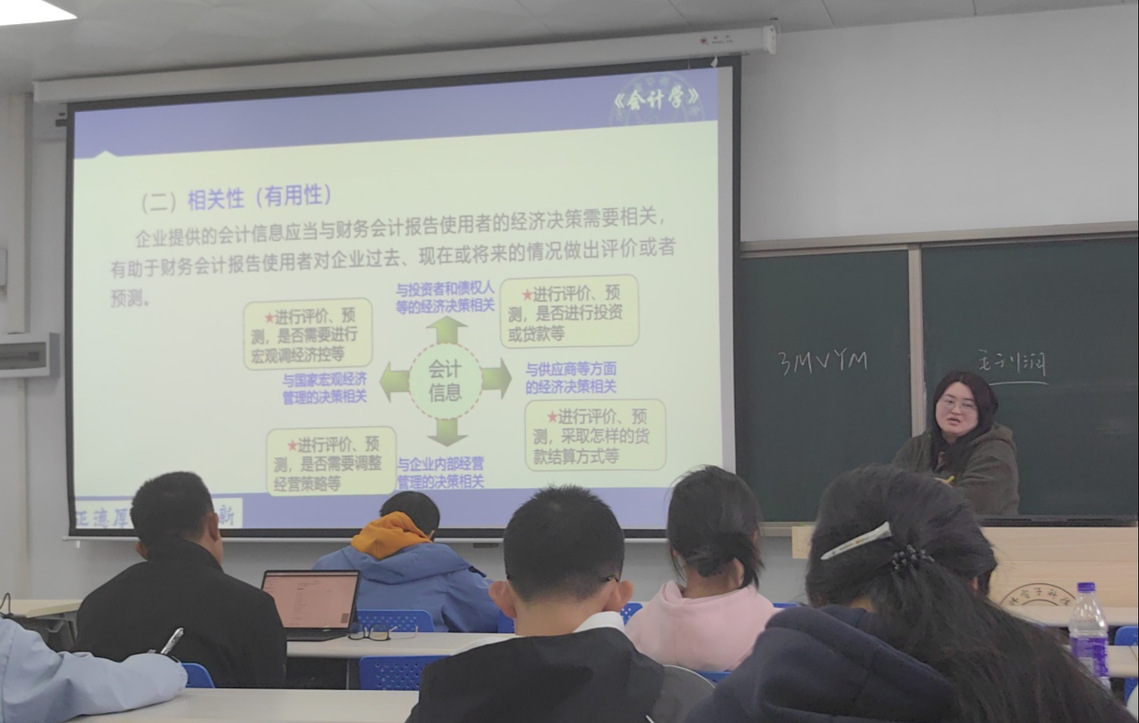 该课程是全校通识选修课,本次授课内容主要围绕会计核算基础这一教学内容展开。杨老师在讲授会计假设、会计信息质量特征等抽象理论时,巧妙嵌入贴近生活的奶茶店经营场景案例——通过拆解奶茶店的具体场景,将晦涩的专业理论转化为具象可感的认知,有效降低了学习门槛。授课过程中,杨老师注重互动引导,通过层层递进的提问启发学生思考、积极研讨;同时借助雨课堂推送实时课堂测试,即时检验学习成效、精准捕捉知识盲区,提升学生课堂参与度。此外,杨老师还在案例讲解中自然融入思政元素,结合奶茶店经营中的诚信记账、合规核算等场景,传递会计行业的诚信准则与责任意识,在传授专业知识的同时兼顾学生价值塑造,实现了“知识传授、能力培养、价值引领”的有机统一。
