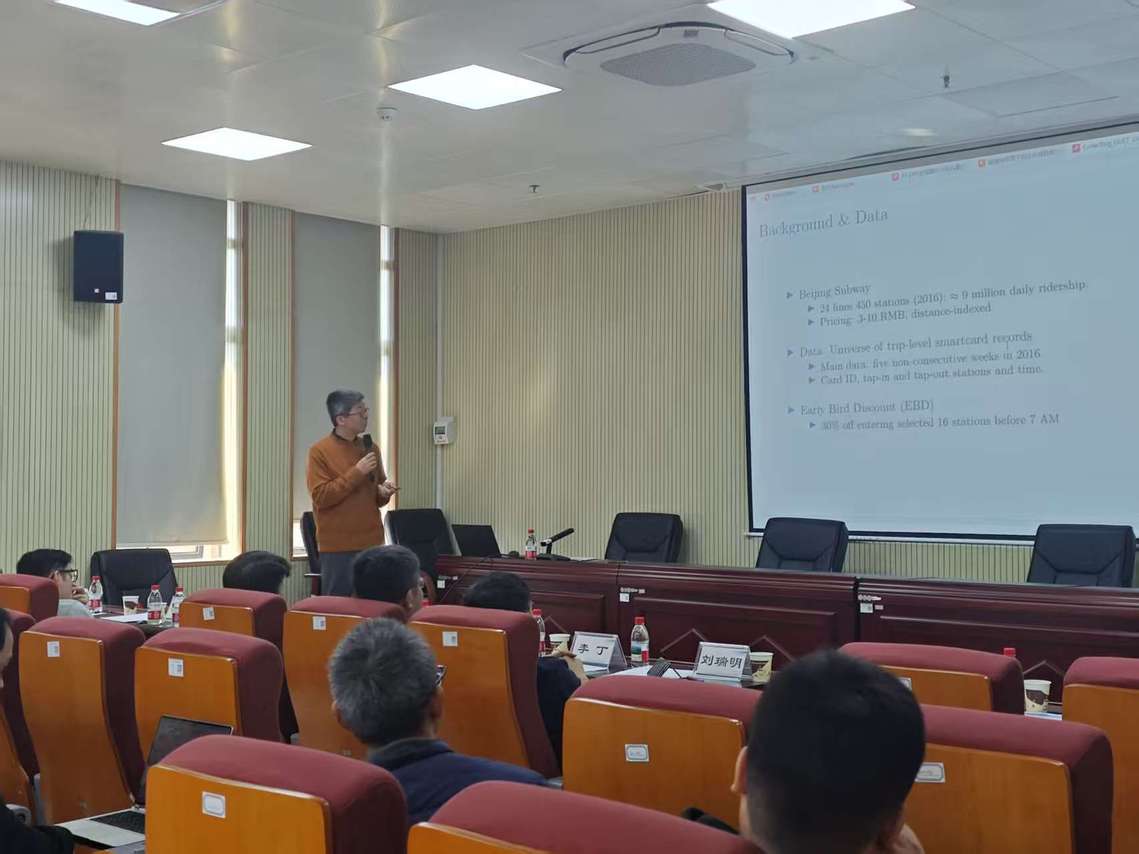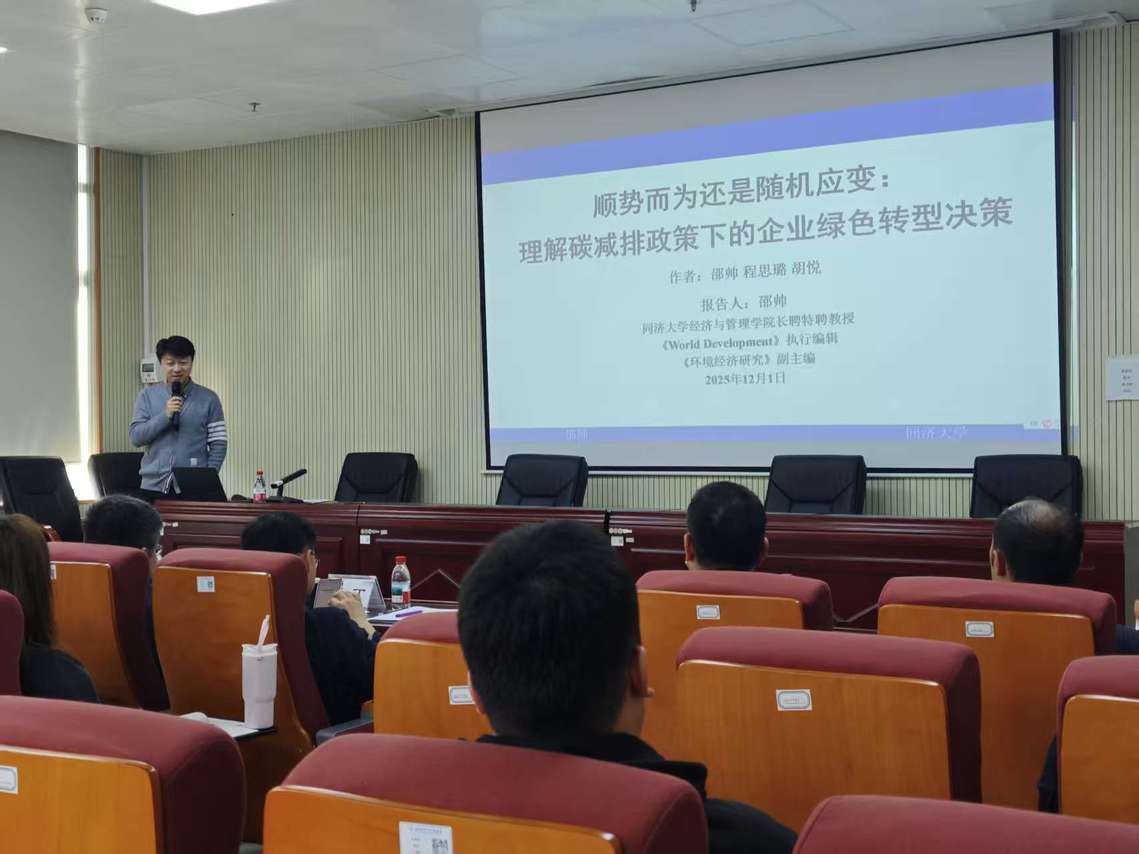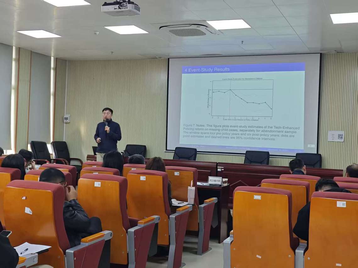 开幕式后,论坛进入上午的专题报告环节,由张发明院长与于飞副院长共同主持。各位学者依次登台分享前沿成果:刘瑞明教授以《Arming Cops, Saving Kids: The Impact of Tech-Enhanced Policing on Missing Children in China》为题,通过实证研究揭示了科技赋能警务在失踪儿童搜救中的关键作用;邵帅教授聚焦《顺势而为还是随机应变:理解碳减排政策下的企业绿色转型决策》,深入剖析政策导向下企业战略响应的内在机制;谷一桢副教授基于北京地铁实证数据,系统阐释了城市交通拥挤的经济成本;江艇副教授则以《The Entrepreneurial Spirit Lost to Floods: Evidence and Mechanisms Across Centuries》为主题,依托长期历史数据挖掘自然灾害对创业精神的深远影响。学者们的报告视角独特、论证严谨,引发台下阵阵思考与热烈互动。